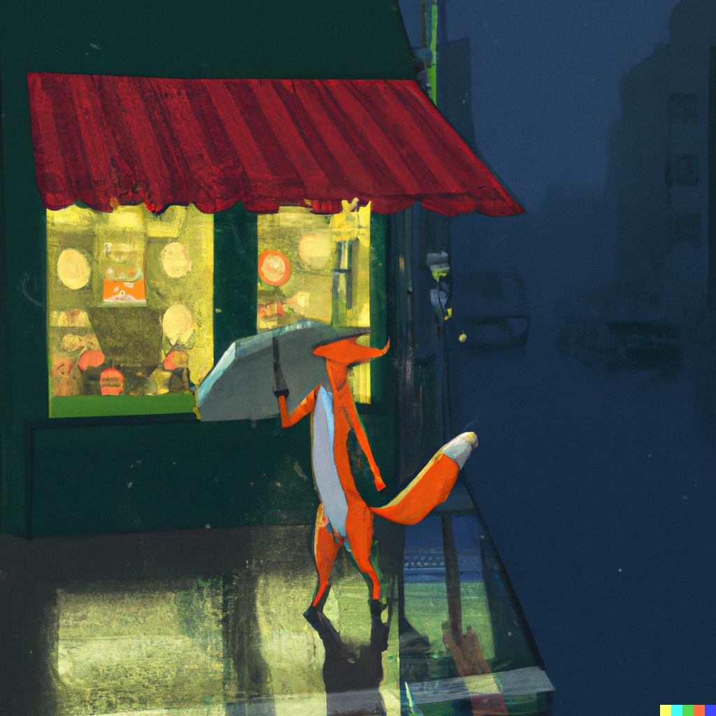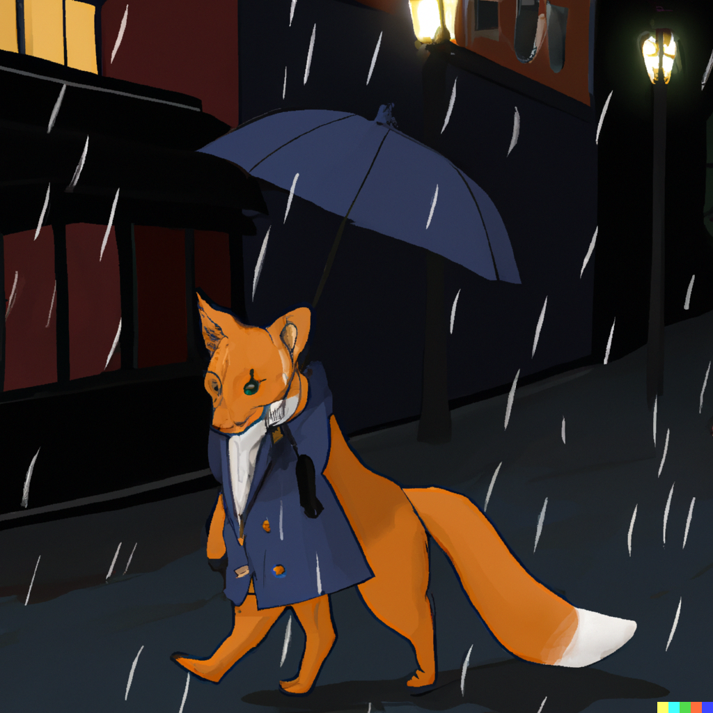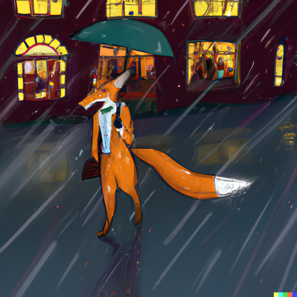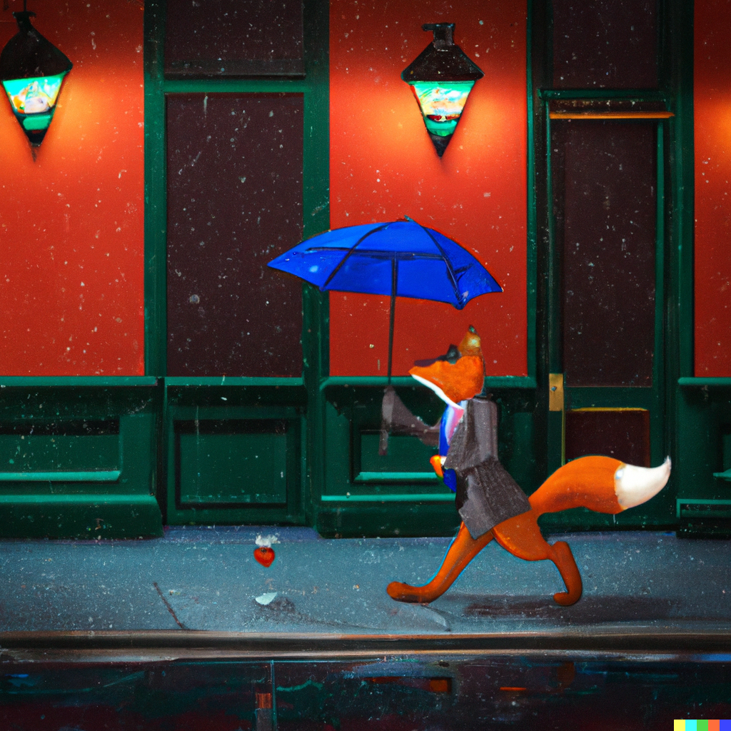 fox walking down the street to a bar on a rainy night holding an umbrella